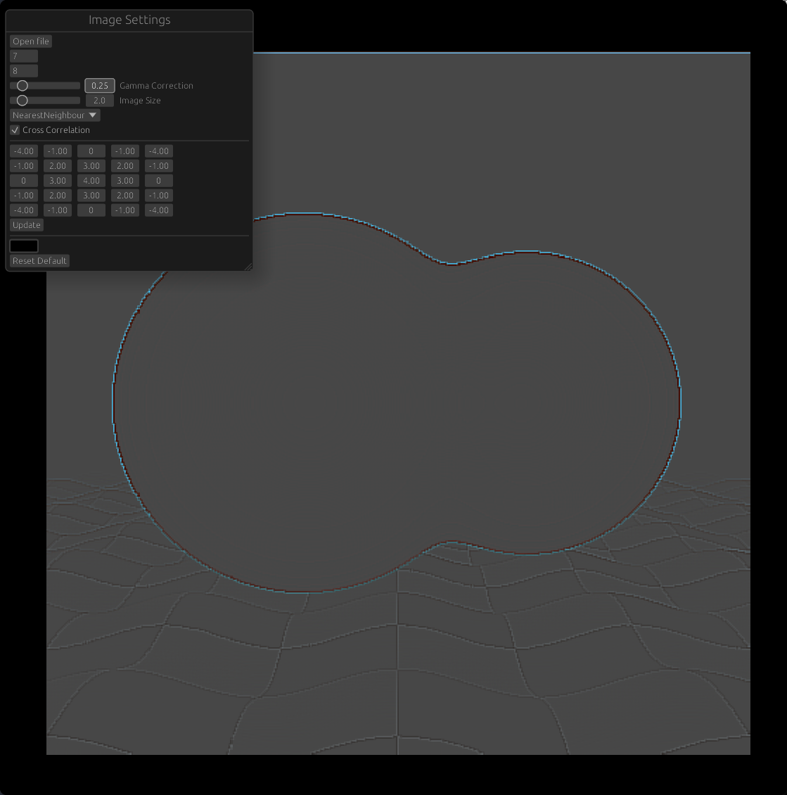All the calculations is done in the Shaders. Gamma Correction creates a lookup texture as it was required for the marks of the coursework. For interpolation, you can choose between nearest neighbor and bilinear interpolation. The program can scale images up to several times their size, this is dependent on your hardware configuration and the max 2d texture buffer your GPU can create. This limit is smaller on web. You can toggle cross correlation on and off, and it will apply the laplacian matrix. The matrix can be tweaked via the interface.