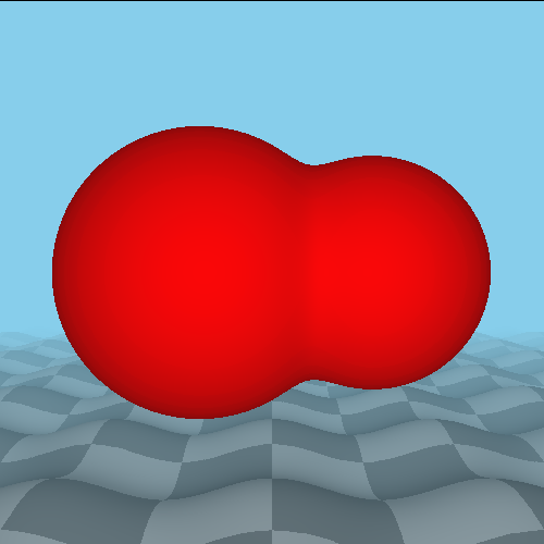 Below is two spheres merged together using a smooth union, above a plane which is distorted with by a wave function. The background is faded into a colour after a certain distance.